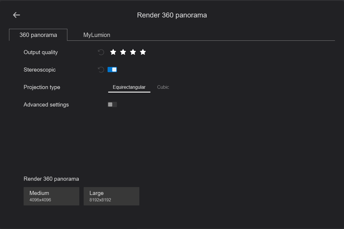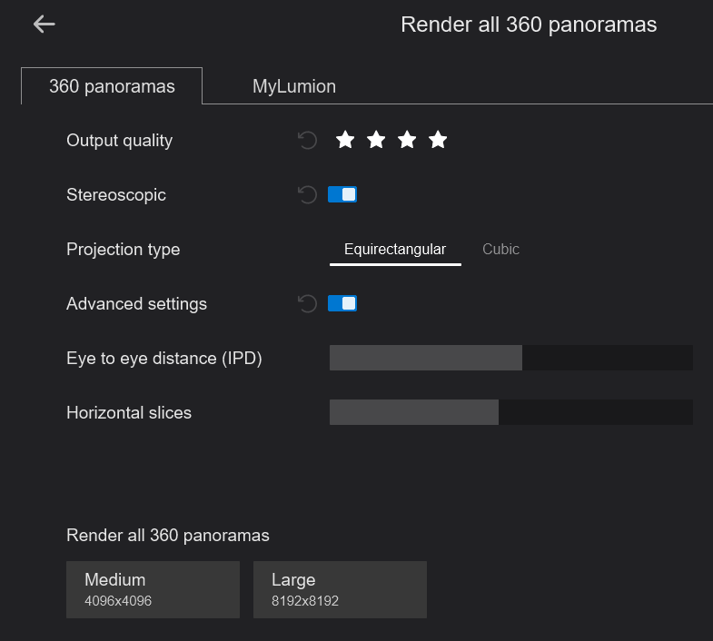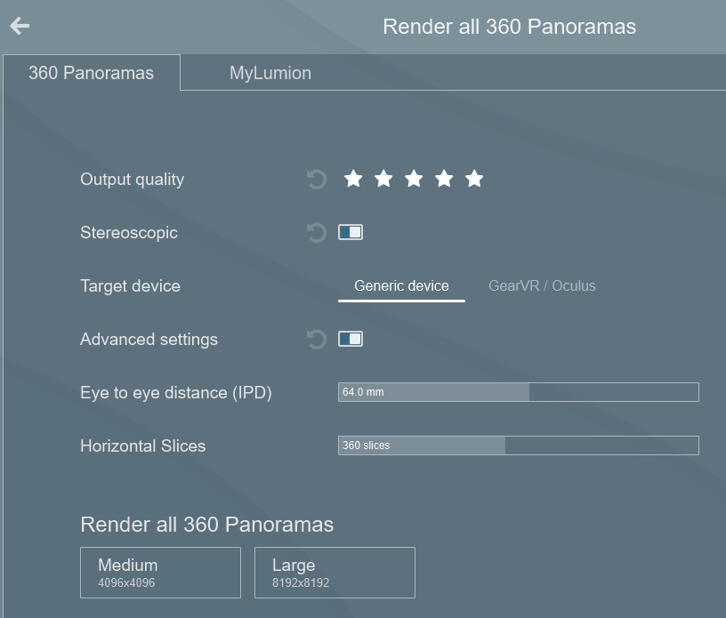 - When you turn the Stereoscopic option on in Lumion, two separate Panoramas will be rendered; one for the left eye and one for the right eye.