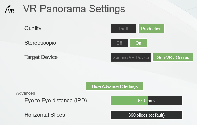 - The higher this slider setting is, the longer it takes to render a Panorama but the better the quality will be. Reducing the Horizontal Slices value can greatly reduce the render times.